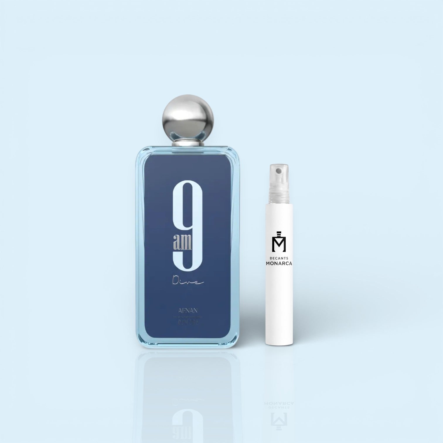 9am Dive de Afnan es una fragancia de la familia olfativa Aromática Acuática para Hombres y Mujeres. 9am Dive se lanzó en 2022. La Nariz detrás de esta fragrancia es Imran Fazlani. Las Notas de Salida son limón (lima ácida), menta, grosellas negras y pimienta rosa; las Notas de Corazón son manzana, cedro y incienso; las Notas de Fondo son jengibre, sándalo, pachulí y jazmín.